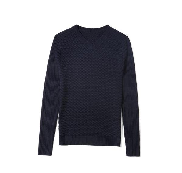 Thick knits and ribbed sleeves create dimension and depth to a more casual choice. Dress it up with a patterned collared button-down, or wool trouser for a laid-back yet sophisticated approach. Finish it off with a striking silver and black leather belt.