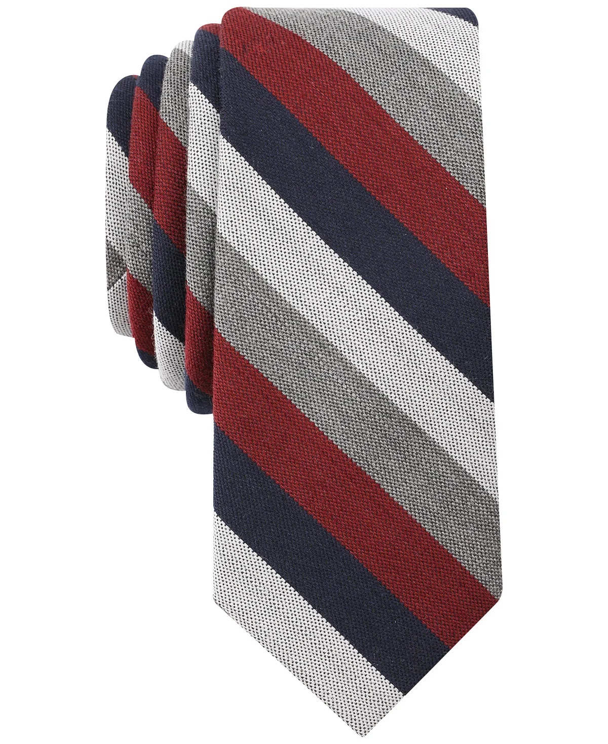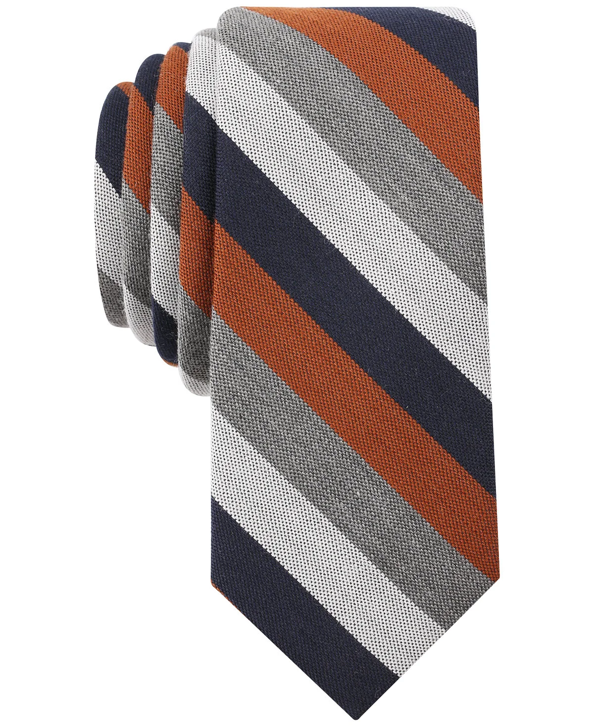 the Men's Dupont Stripe Skinny Tie from Bar III is the place to start. Available in 3 different color combinations to match to your own personality, the tie boasts delicate design in a pleasant diagonal stripe pattern. The navy and grey accents in each variation make the tie perfect for subtly matching with suits of the same shade. Instead of wondering whether you look put together, you’ll know you’re in style with the soft fall tones and traditional colors encouraging you to be both bold and classic.