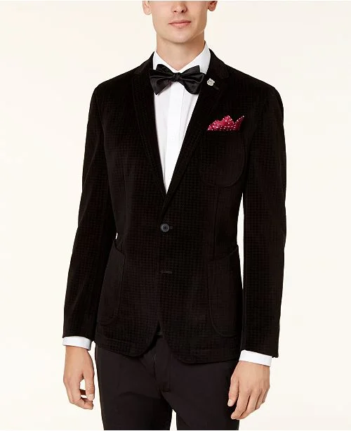 Take the Men's Slim-Fit Black Velvet Houndstooth Dinner Jacket, from the Nick Graham collection at Macy’s, with its nonchalant crispness and delicate attention to cut and print. The houndstooth pattern creates movement and texture for the eye to enjoy while the velvet hints at a the daring of a timeless bold choice. Pair this jacket with your favorite nighttime look and be the talk of the town this season.