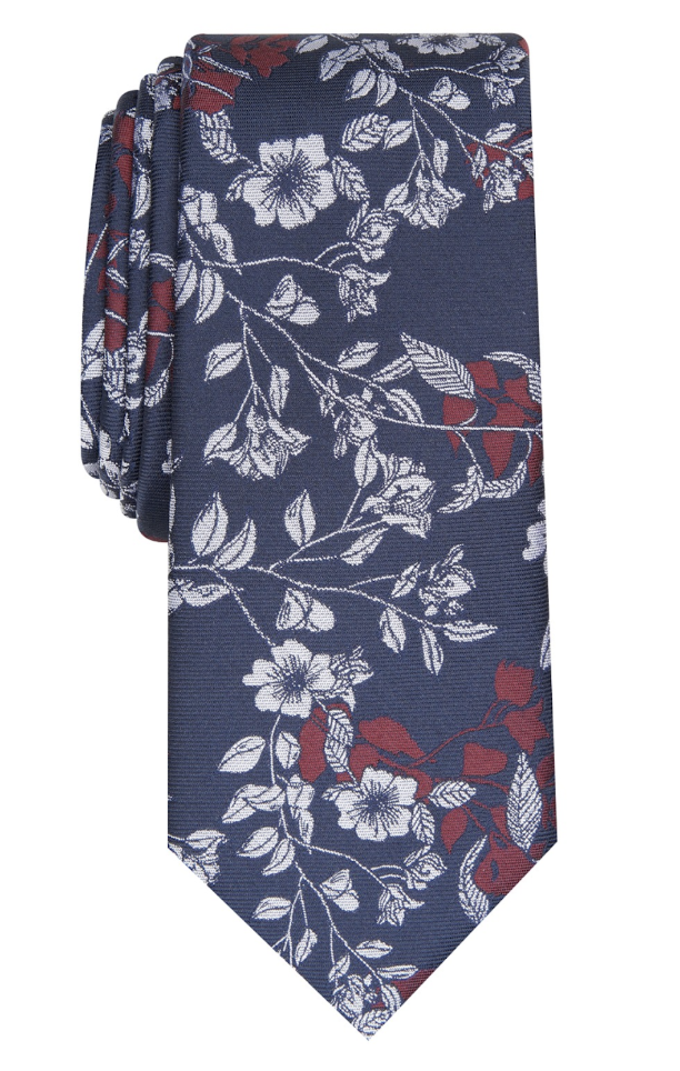 Take, for example, the Men's Poplar Skinny Floral Tie from the Bar III collection created for Macy's. With its rich navy background and budding intricate blooms in complementary white and red, this necktie will match most items and certainly enhance your overall presentation. Wear with the burgundy shirt from above and a pair of dress pants in any shade of blue or grey to rise up the ranks of fashion forward royalty!